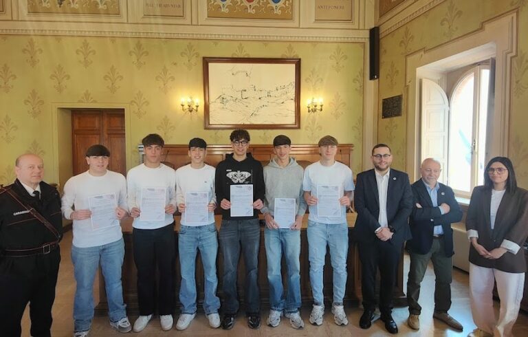 Il sindaco di Marsciano Michele Moretti riceve in Municipio i protagonisti della restituzione del borsello perduto alla presenza anche del vicesindaco Sergio Pezzanera e del maresciallo capo Raimondo Savastano