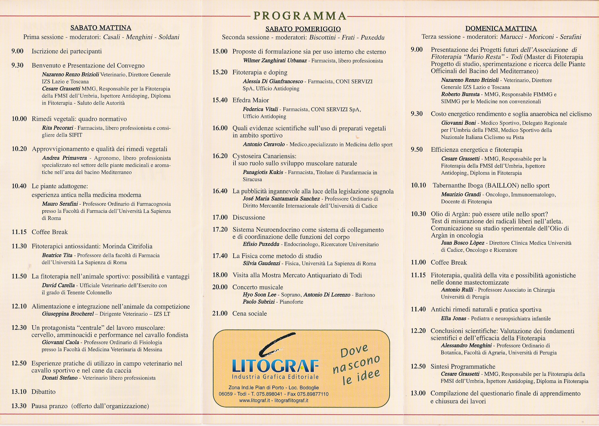 Il convegno, ufficialmente riconosciuto come tappa del percorso ECM (educazione continua medica), affronterà la tematica da due versanti: da quello umano a quello animale, con particolare attenzione ai cavalli ed ai cani e quindi interesserà anche il mondo veterinario, presente nelle sue varie articolazioni mediche, farmacologiche e biologiche con figure istituzionali di prestigio quali il Preside della facoltà di veterinaria dell’Università di Perugia, prof. Franco Moriconi, ed il Direttore Generale dell’Istituto Zooprofilattico Sperimentale per il Lazio e la Toscana, dr. Nazareno Renzo Brizioli, nonchè innumerevoli esperti che si succederanno sullo scranno della sala del Consiglio dei palazzi municipali per sviscerare gli argomenti loro assegnati o moderare la discussione.