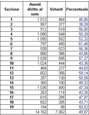 In attesa che pervengano i dati degli ultimi cinque seggi, annotiamo che a livello di affluenza, questa è stata del 67,39%, praticatamente quasi uguale di quella del ballottaggio del 1999, tra Chiacchieroni e Di Mario, quando fu pari al 67,93%. Sarà interessante vedere quali percentuali il nuovo sindaco avrà rispetto ad allora.