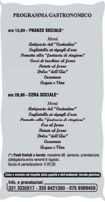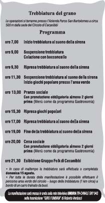 Una giornata piena, come una volta: una sosta per  “il bocconcello” alle ore 9, interruzione alle 11,30 per prepararsi al pranzo sociale su prenotazione delle 13,00, giochi popolari durante gli intervalli, ripresa della trebbiatura alle 17,00 e cena sociale alle ore 20,00.