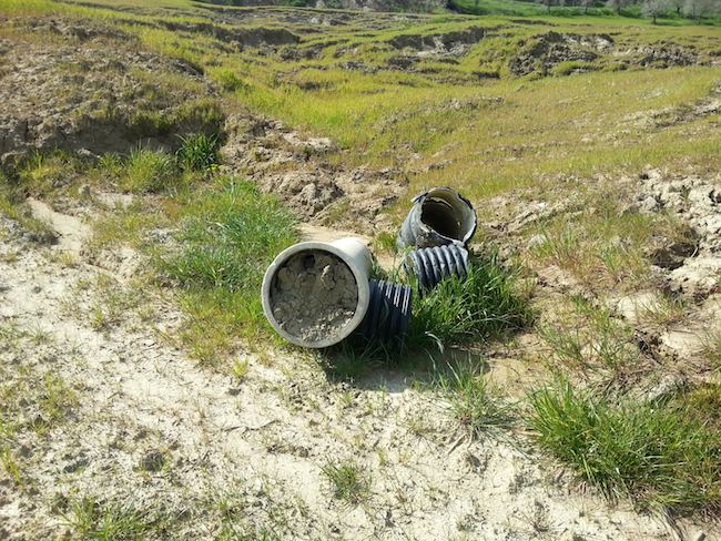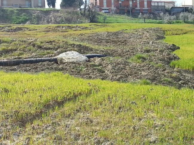 - sul posto sono visibili tubazioni rotte che emergono in superficie, materiali in eternit sparsi sui campi e pozzetti di filtraggio divelti e quindi non più funzionanti;