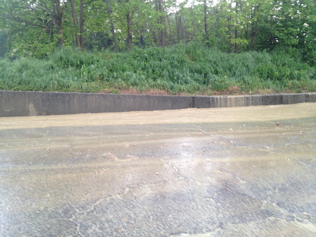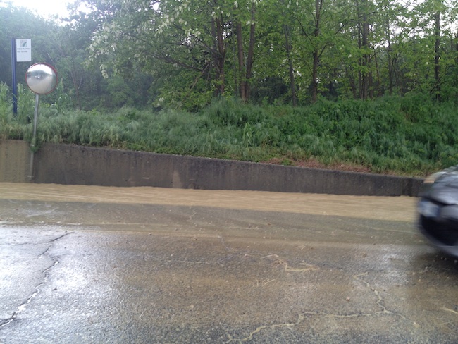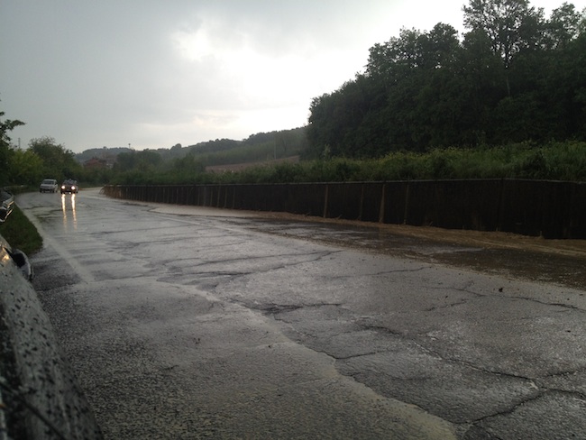 L’ennesima “bomba d’acqua” si è abbattuta sulla zona, provocando consistenti allagamenti della sede stradale, accompagnati dal trascinamento di fango e detriti dai campi soprastanti. L’acqua in alcuni tratti ha invaso completamente entrambe le corsie di marcia, raggiungendo un’altezza anche di oltre 15 centimetri, mettendo in pericolo la sicurezza di marcia dei veicoli.