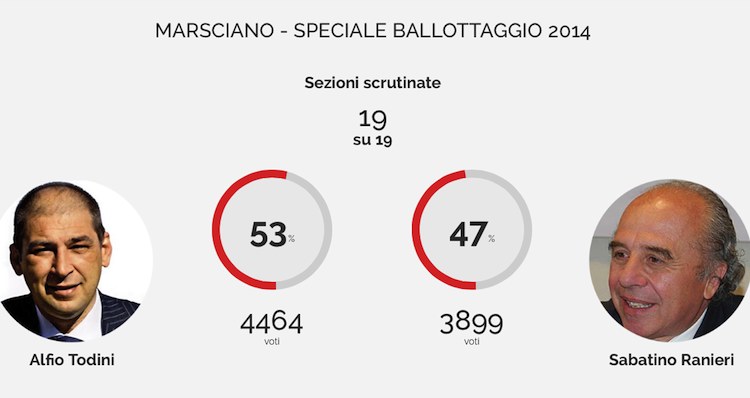 Alfio Todini guiderà la città di Marsciano per altri 5 anni. I cittadini marscianesi con il voto di ballottaggio di domenica 8 giugno, gli hanno riconfermato la fiducia con 4.464 voti pari al 53,38% dei votanti. Todini si è imposto per 565 voti su Sabatino Ranieri che ha raggiunto la quota del 46,62% pari a 3.899 voti. L’affluenza rispetto al primo turno è stata piuttosto bassa, raggiungendo solo il 58,99% degli aventi diritto al voto.