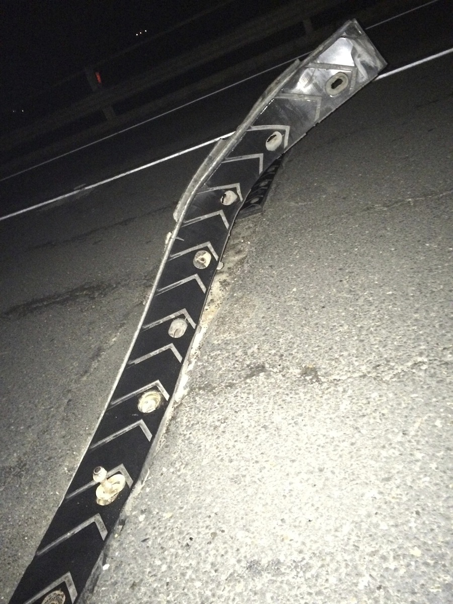 La struttura metallica che fa da giunto fra i vari elementi del viadotto evidentemente non ce la faceva più a stare al suo posto e s’è letteralmente alzata come una scimitarra a colpire lo sfortunato mezzo che passava in quel momento ed a mostrare al mondo le sue condizioni d’abbandono e ruggine.
