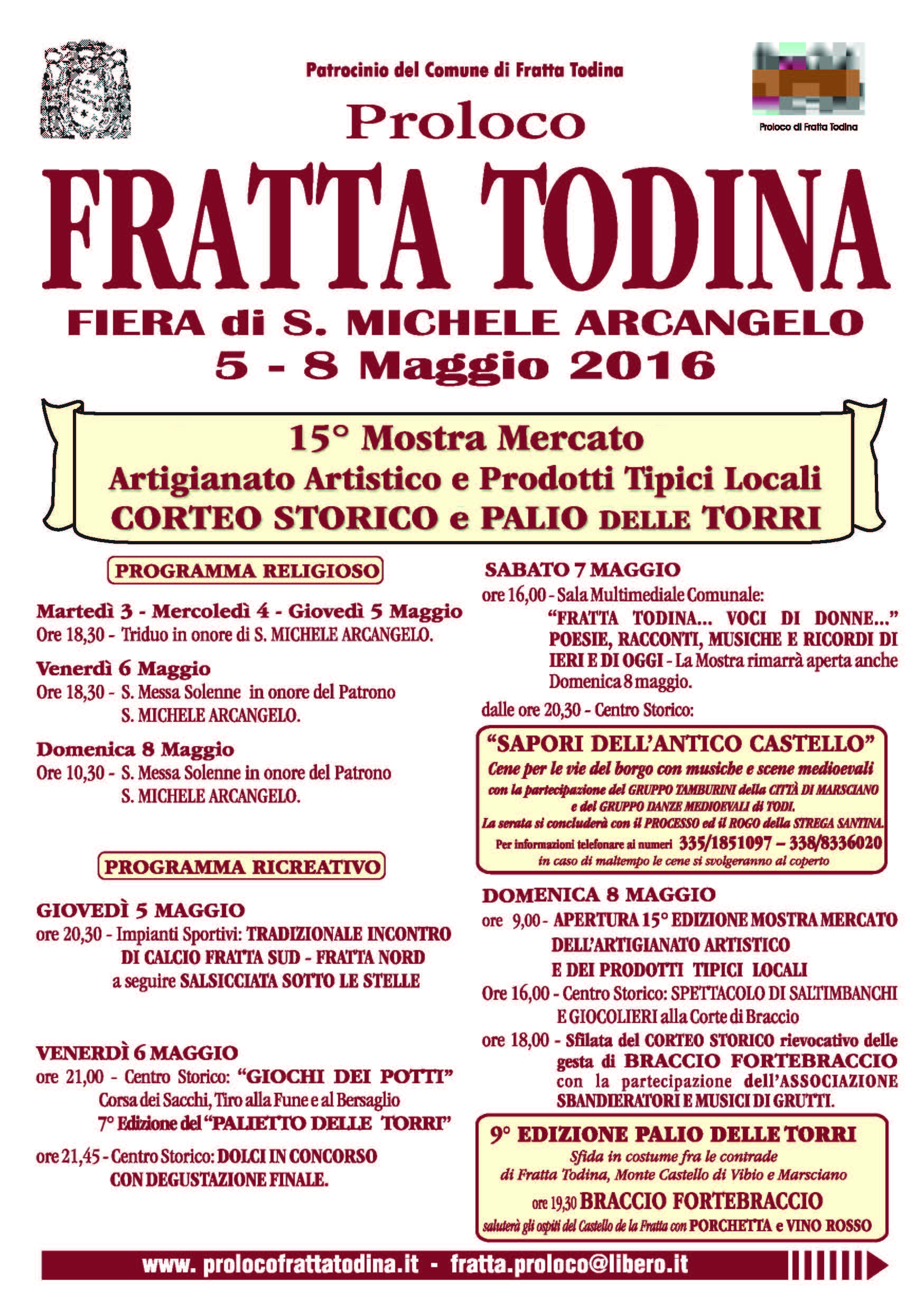 La Fiera di San Michele Arcangelo, patrono del borgo di Fratta Todina, ha origini molto antiche: il bando risale infatti al 1600 e fu concessa alla comunità di Fratta per volere del Vescovo Angelo Cesi. Nel 2000 la Fiera, grazie al lavoro della Pro Loco è stata riscoperta e riproposta, puntando sulla “mostra mercato dell’artigianato artistico e dei prodotti tipici locali” di cui vuol tutelare la peculiarità e favorire la commercializzazione.