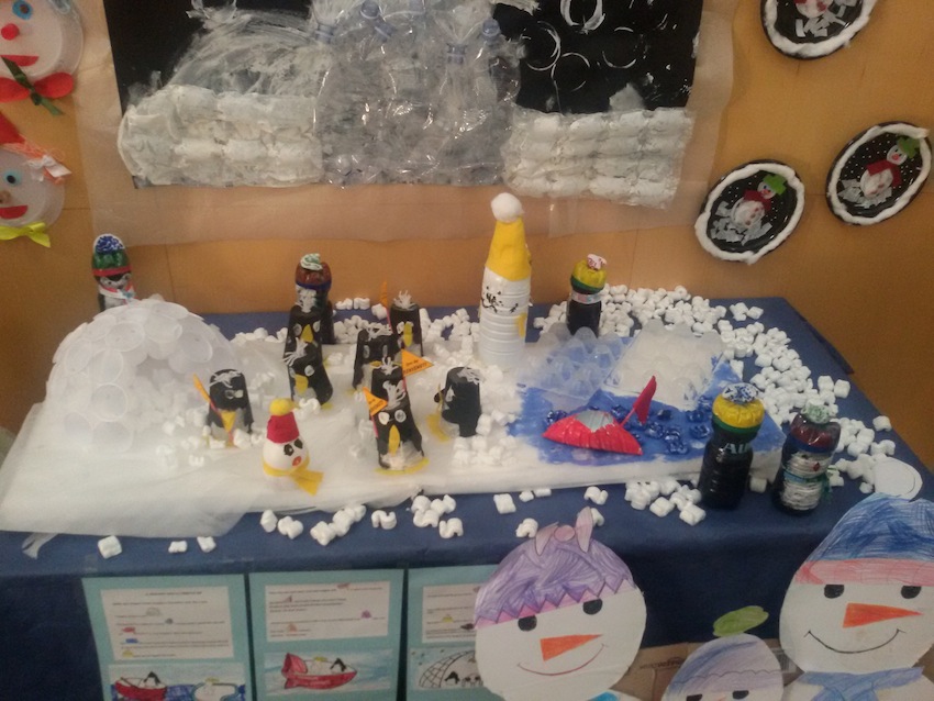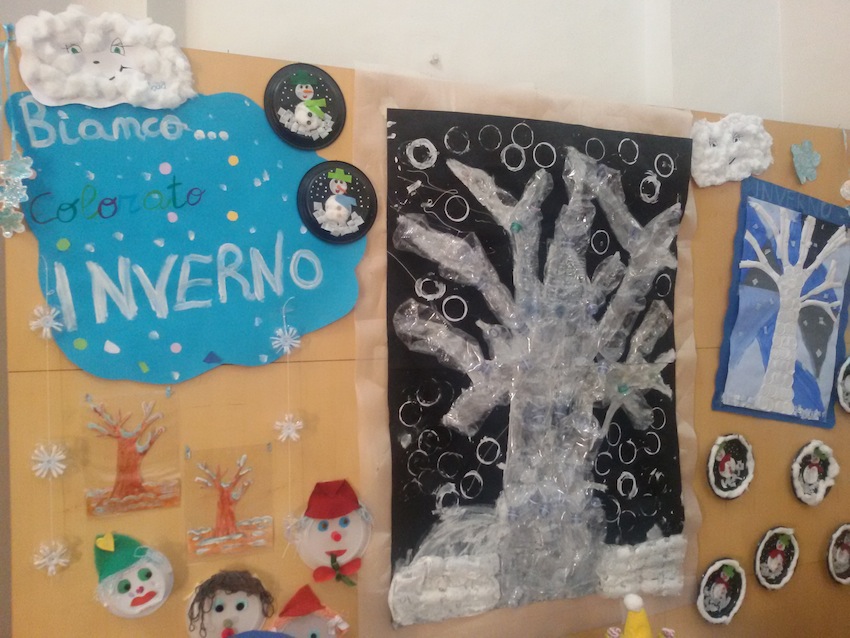 Nella stagione dell’inverno la plastica è stata utilizzata come base per alberi innevati, pinguini, pupazzi di neve e quadri d’autore.