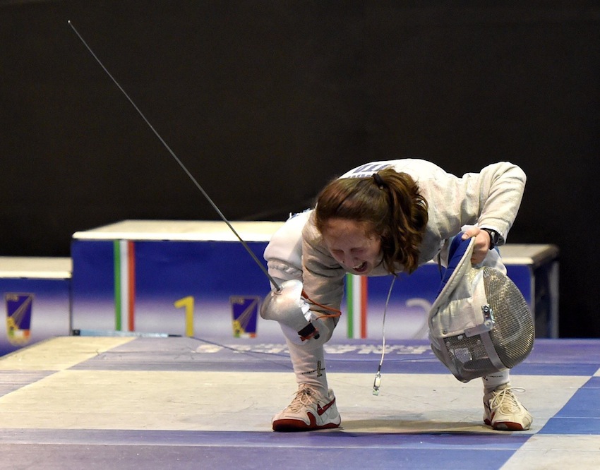 Amelia aveva infatti battuto, in un rocambolesco ottavo di finale, la numero due della classifica nazionale, la sulmonese Manuela Spica della Gymnasium Aquila: sotto di quattro punti alla pausa, la più piccola delle sorelle Giovannelli si era poi imposta per 15 a 13. In semifinale, contro un’altra padovana del Petrarca, Lucia Stefanello, l’umbra allenata dal maestro Andrea Aquili per i colori del Frascati scherma faceva un altro grande recupero: sotto per 11 a 14, concludeva la gara in suo favore con il punteggio di 15 a 14 (nel video la stoccata decisiva per l’accesso alla finale).