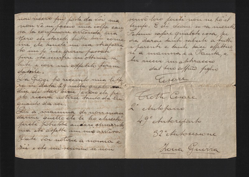 La missiva è quella di un figlio che scrive al padre (a cui si rivolge con il “Voi”), per dare rassicuranti notizie di sé al genitore e per riceverne da lui. Cesare Trotti accenna al padre le vicissitudini di guerra, “Se sapeste quante avventure abbiamo passate voi non ci credereste; né d’altronde potrei raccontarvi per lettera”, ma dice anche di godere di ottima salute e di “un appetito formidabile”.