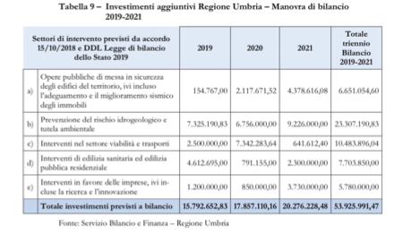 “In modo particolare – ha aggiunto la presidente – vengono concentrate tutte le risorse che accompagnano i cofinanziamenti per le imprese per lo sviluppo economico, ma la grande novità di questo Defr – per Marini – è rappresentata dalla possibilità di fare investimenti nel triennio per 53 milioni di euro che sono circa 17 milioni già nel 2019, e gli altri sull’intero triennio, in seguito all’Accordo tra Regioni e Governo per sostenere quattro ambiti di investimenti pubblici che sono: tutte le opere legate al dissesto idrogeologico e al governo del territorio, sulla viabilità, sulla edilizia sanitaria, sulle imprese per gli investimenti che vanno a cofinanziare interventi delle imprese e sul patrimonio pubblico regionale. E’ evidente – ha proseguito – che questa mole di investimenti che deriva anche dagli avanzi del bilancio della Regione permetterà di sostenere il sistema economico e soprattutto un settore come quello dell’edilizia che è stato fortemente penalizzato in questi anni. E’ una ripartenza molto significativa degli investimenti pubblici, anche per aggredire criticità che sul territorio abbiamo come la manutenzione straordinaria della viabilità e quella del dissesto idrogeologico e della prevenzione in questo ambito. Si tratta – ha concluso Marini di un bilancio sano che non impone nessuna variazione della tassazione che non ha alcun inasprimento fiscale e che presenta una cornice espansiva molto positiva”. Sui tempi di approvazione dei provvedimenti già preadottati dall’esecutivo, la presidente ha annunciato che questa settimana, ci sarà l’approvazione della Giunta regionale a cui seguirà la discussione nelle Commissioni consiliari. Il pacchetto dovrebbe chiudersi con la definitiva approvazione dell’Assemblea legislativa dell’Umbria entro il 20 dicembre.