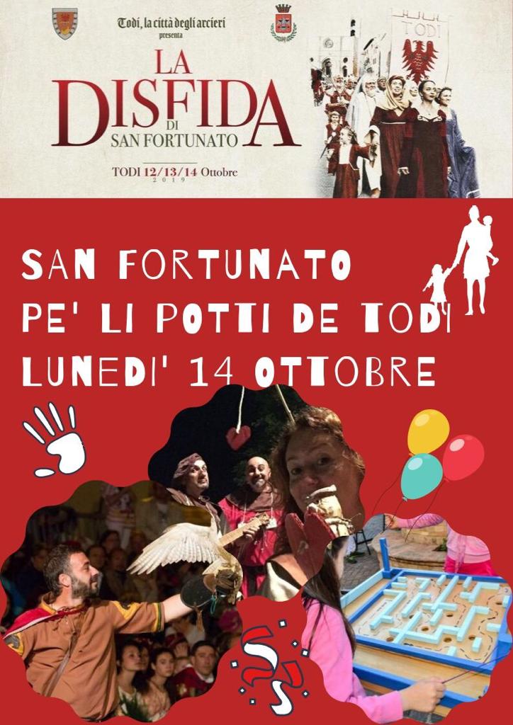 •La giornata dei bambini “San Fortunato, la festa pe’ li potti de Todi”. Il 14 ottobre, il vero giorno della festa patronale, sarà interamente dedicato ai bambini tuderti con attrazioni e giochi di tutti i tipi: i laboratori, le dimostrazioni dell’arte della falconeria con spiegazioni e voli a cura di “Zefiro Falconeria”, i divertenti spettacoli itineranti de “La Compagnia di Santo Macinello” e i giochi tradizionali di Ludobus-Legnogiocando.
