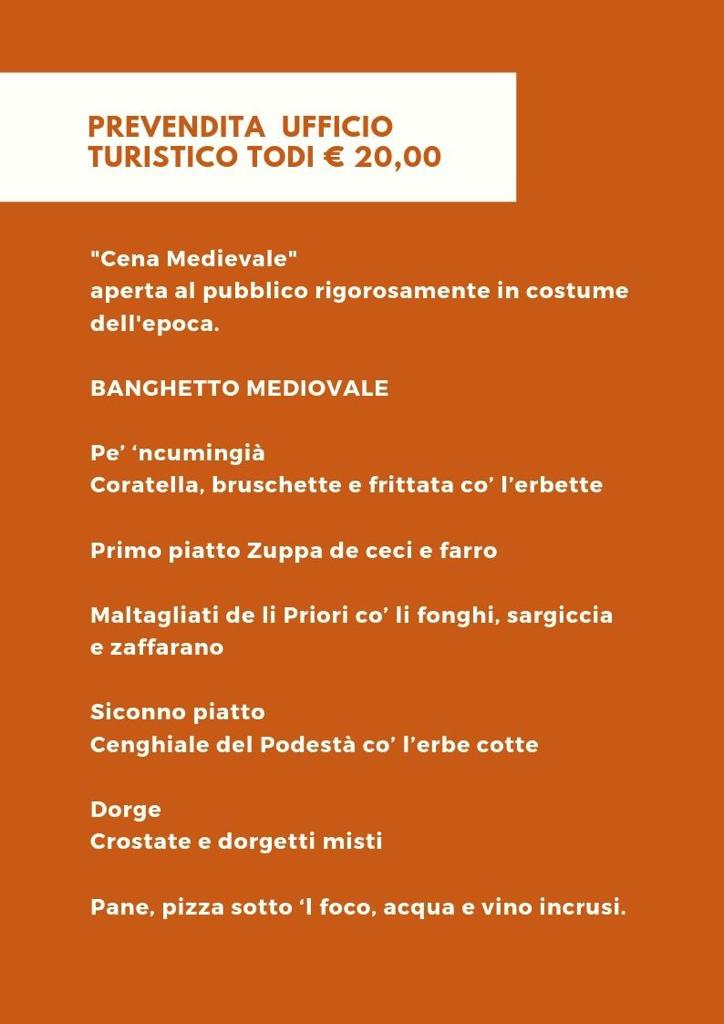 •Le danze della Compagnia Medievale di Todi: un’altra piccola eccellenza tuderte, visto che le loro esibizioni sono sempre molto richieste ed applaudite in tutte le feste storiche del centro Italia. Il gruppo è formato da 10 elementi, sia ballerine che ballerini: quest’ultimi con piacere si esibiscono anche in dimostrazioni di combattimento corpo a corpo con riproduzioni di armi medievali.
