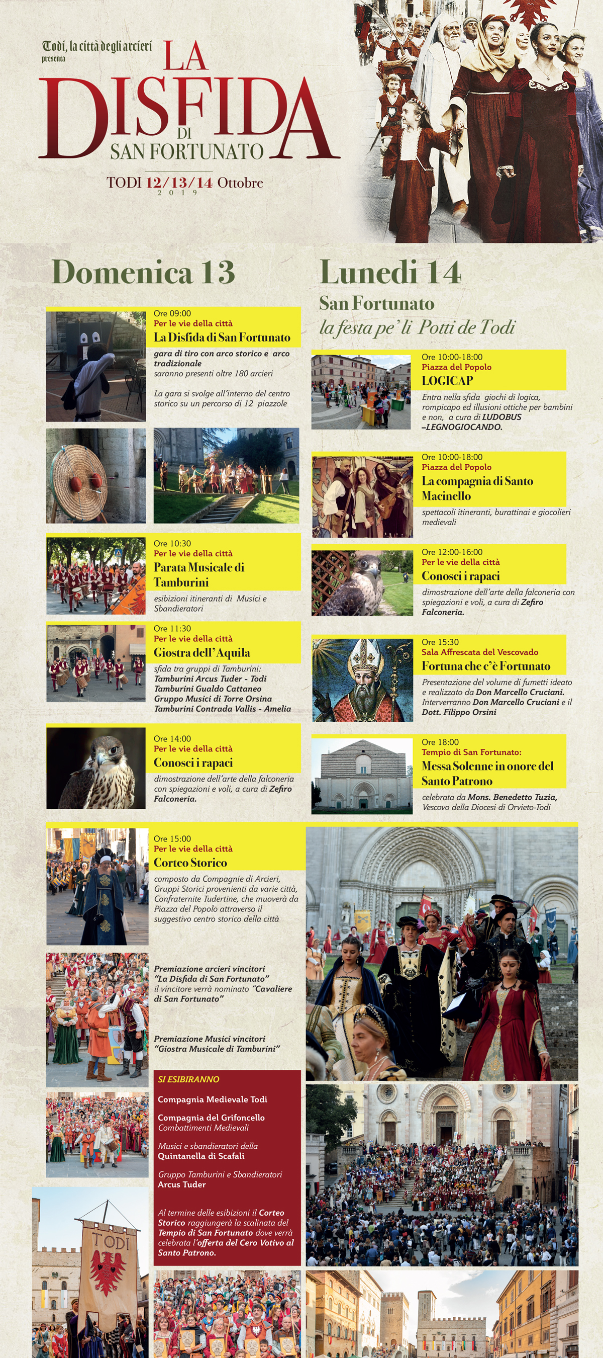 •Il torneo di tiro con l’arco “Il palio dell’aquila” che si svolgerà sabato pomeriggio sulla scalinata del duomo e che vedrà sfidarsi gli arcieri dei sei rioni storici di Todi.
