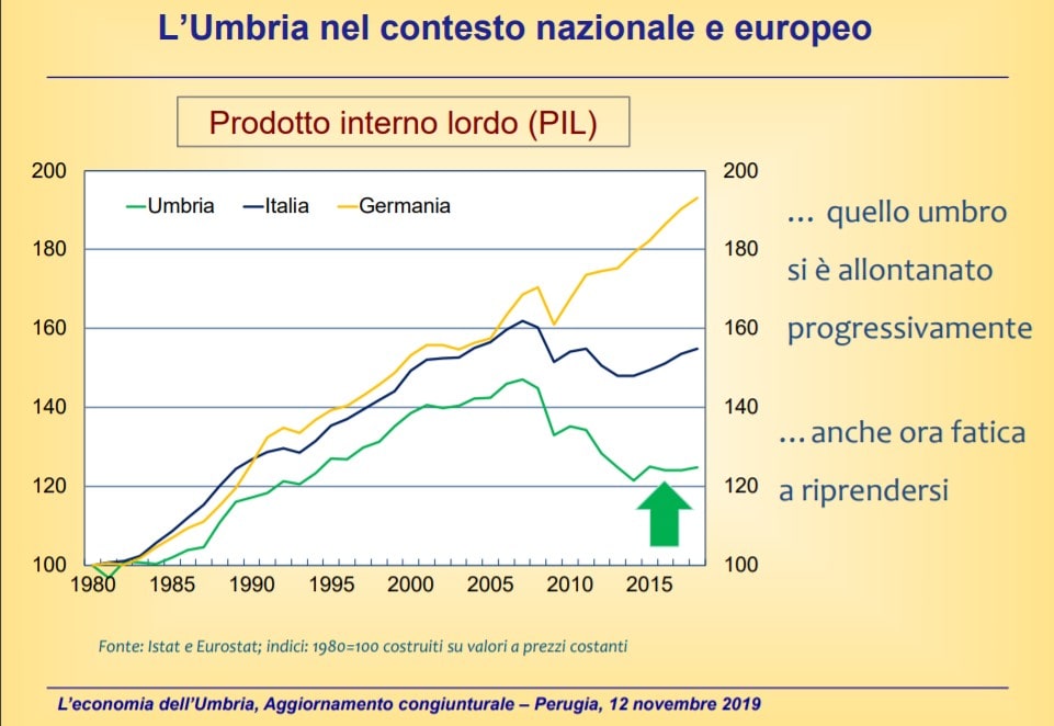 Un ‘buco’ annuo di grandi dimensioni se si pensa che si può calcolare che, in termini reali, negli ultimi 10 anni l’Umbria – sempre facendo il confronto con la media nazionale – ha avuto un ‘buco’ complessivo di produzione di ricchezza (frutto della somma dei ‘buchi’ di ogni anno) pari a oltre 23,7 miliardi di euro.