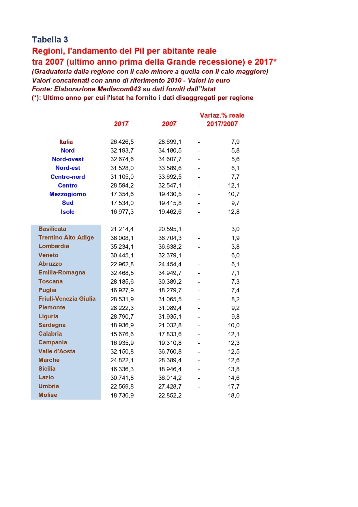Tra le circoscrizioni territoriali, nel 2017 il Nord ha un Pil pro capite medio inferiore in termini reali del 5,8% rispetto a quello del 2007, il Centro-Nord segna invece -7,7%, il Centro -12,2%, il Mezzogiorno d’Italia il -10,7% (con il Sud continentale che fa -9,7% e le Isole -12,8%). Tra le regioni italiane, sempre in termini di Pil per abitante soltanto la Basilicata ha non solo recuperato, ma superato del 3% il livello del 2007. Secondo miglior risultato quello del Trentino Alto Adige (-1,9%), al terzo posto la Lombardia (-3,8%). In coda, l’andamento peggiore lo mostrano il Molise (Pil pro capite reale -18% tra 2007 e 2017), l’Umbria (-17,7%) e il Lazio (-14,6%).