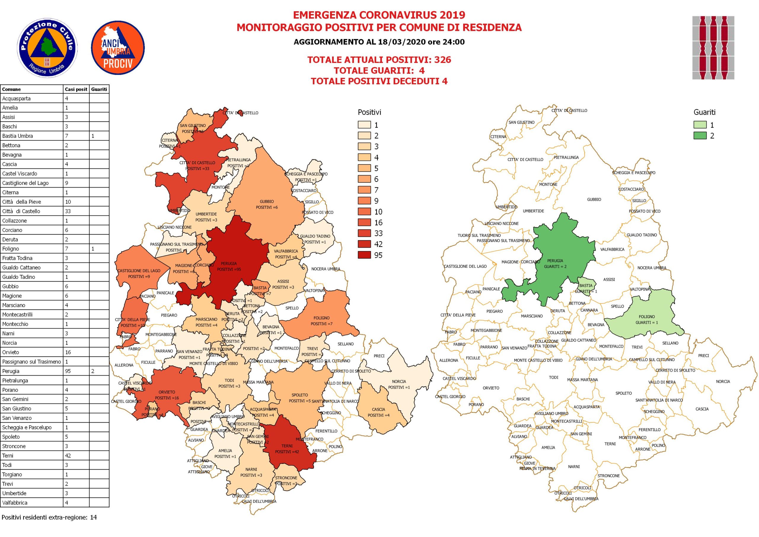 Negli altri Comuni, ci sono 2 casi positivi a Deruta, 2 a Collazzone (come appena comunicato dal Sindaco poco fa) e 1 a San Venanzo. Ancora indenni dal contagio i comuni di Massa Martana e di Monte Castello di Vibio.