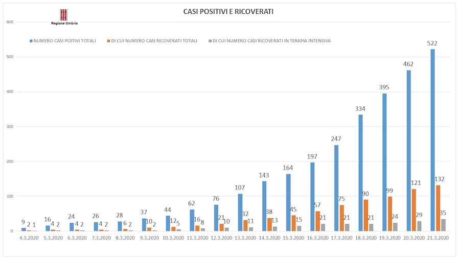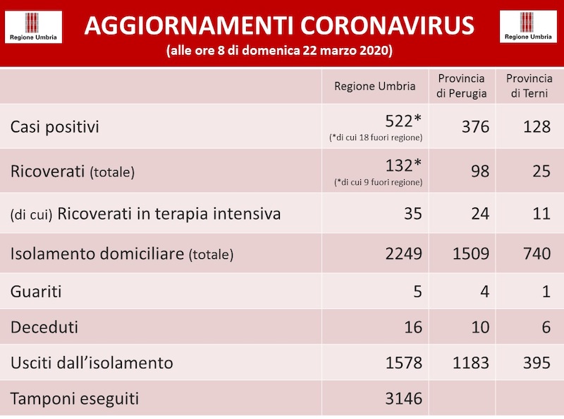 Dai dati aggiornati alle ore 8 di domenica 22 marzo, 522 persone in Umbria risultano positive al virus Covid-19, i guariti sono 5 di cui 4 nella provincia di Perugia e 1 in quella di Terni.