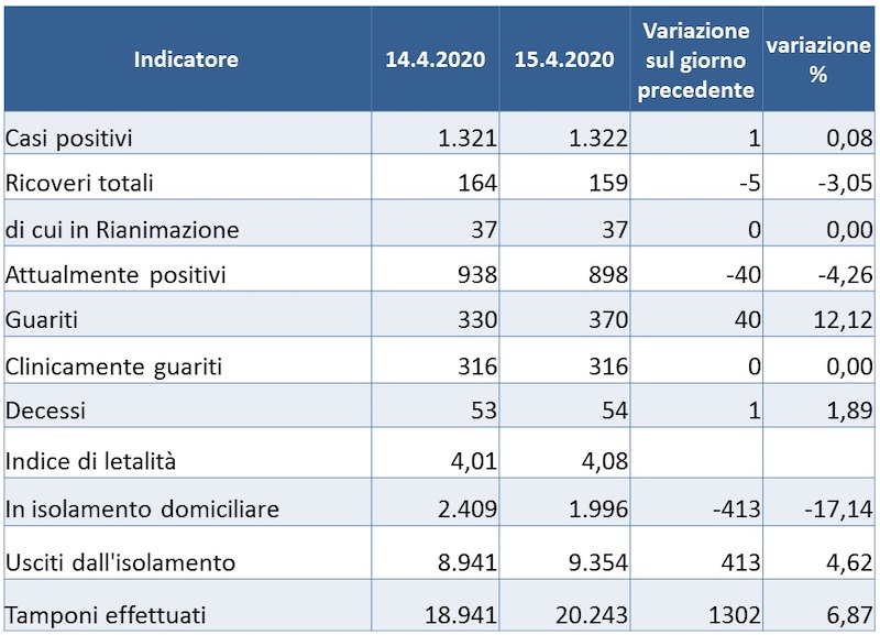 Le persone in isolamento domiciliare sono 1996 (-413), sono usciti dall’isolamento 9354 soggetti (+413). Nel complesso entro le ore 8 del 15 aprile, sono stati eseguiti 20.243 tamponi (+1302).