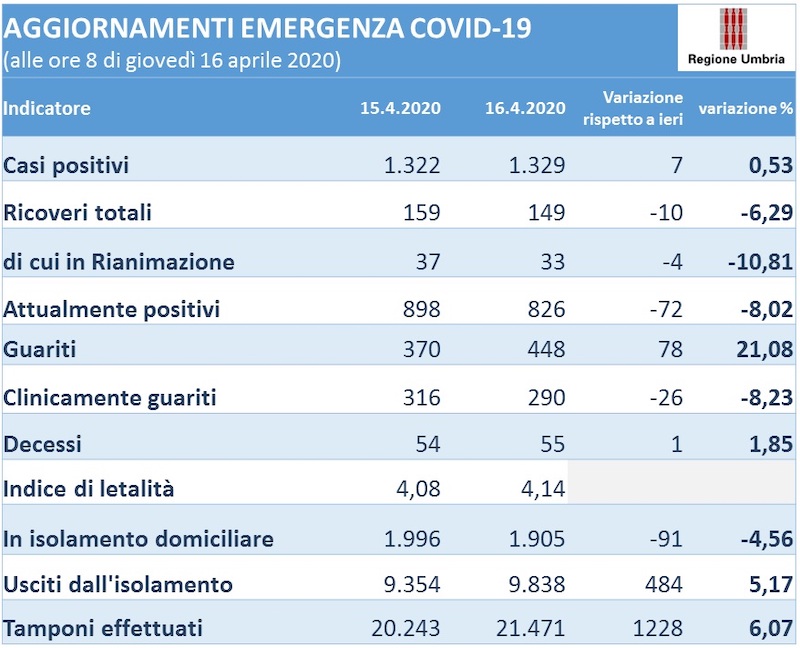 Dopo due giornate con un solo contagiato, i dati aggiornati alle ore 8 di giovedì 16 aprile, fanno registrare nella giornata di ieri 7 nuovi positivi, che fanno salire a 1329 il totale delle persone che in Umbria risultano positive al virus Covid-19, mentre gli attualmente positivi sono 826 (- 72).