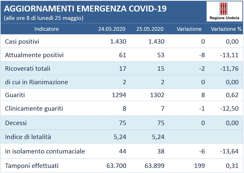 Sono complessivamente 1.430 persone (invariato) in Umbria sono risultate positive al virus Covid-19 in base ai dati aggiornati a questa mattina; gli attualmente positivi sono 53 (-8).