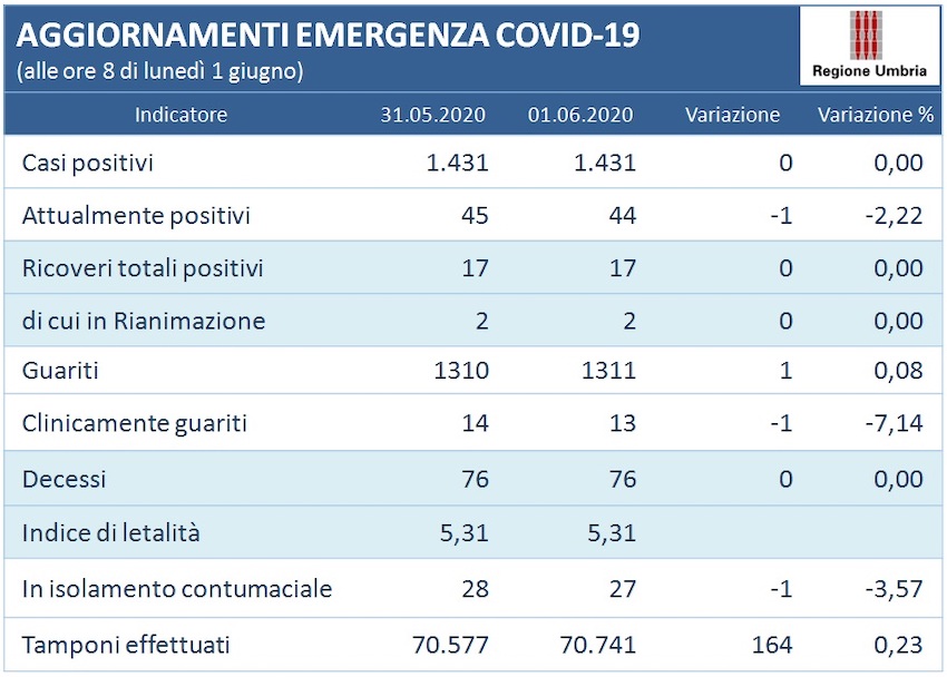 I dati della Regione Umbria sul contagio da Coronavirus, mostrano un deciso calo di tutti i numeri, ad eccezione naturalmente del numero complessivo dei casi che è cresciuto, anche se in maniera modesta, passando da 1.393 casi al 1 maggio a 1.431 al 31 maggio (+38).