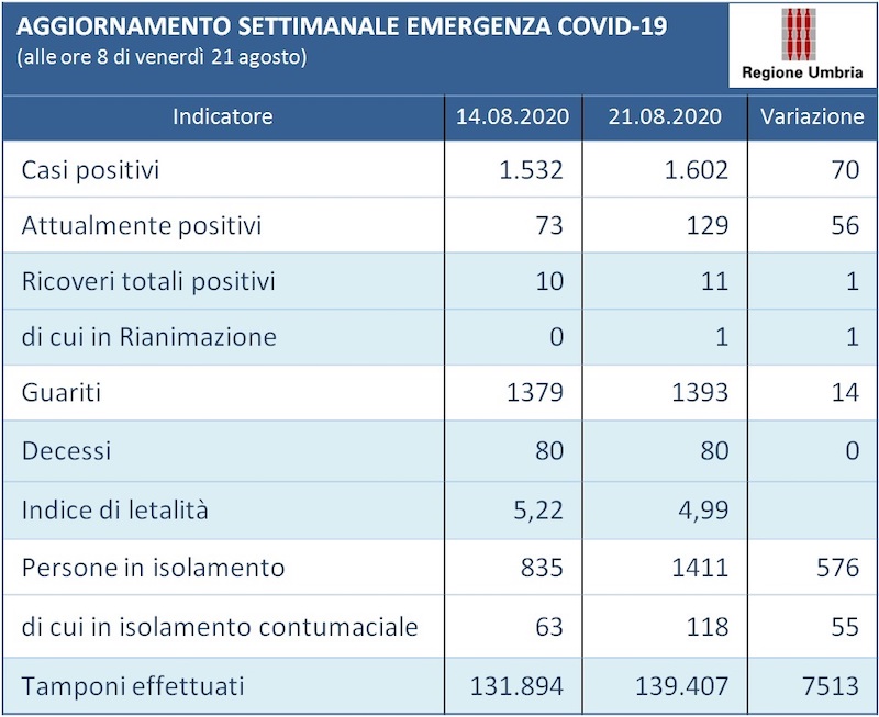 Questi i dati completi, riferiti alla settimana dal 14 al 21 agosto, aggiornati alle ore 8 di venerdì 21 agosto: i casi positivi sono passati da 1.532 del 14 agosto a 1.602 di oggi (+ 70); gli attualmente positivi da 73 sono diventati 129 (+ 56).