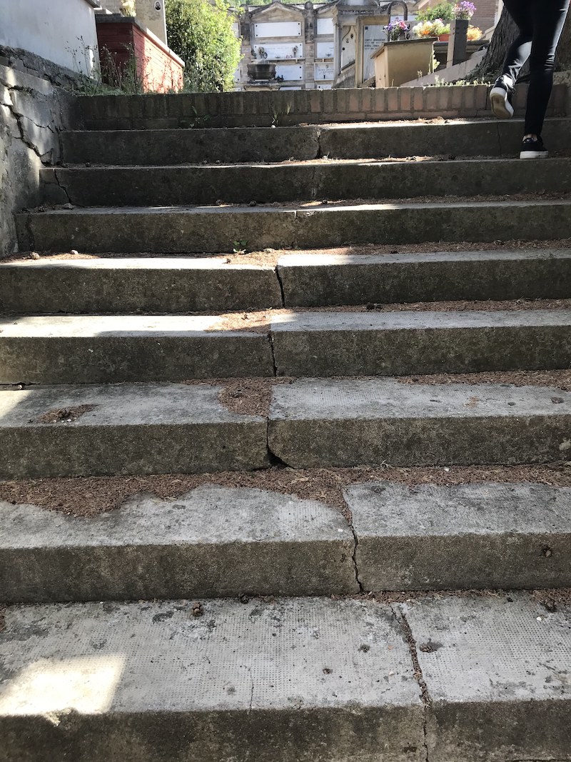 Dalle foto si può notare l’assoluta mancanza di pulizia delle stradine e delle scale che le rende anche particolarmente insidiose soprattutto nel periodo invernale. L’assenza della manutenzione del verde e il mancato ritiro dei rifiuti, lo scarico perennemente intasato della fontanella e i numerosi distacchi di parti di muratura dei loculi, sono oramai una costante, di cui nessuno sembra preoccuparsi.