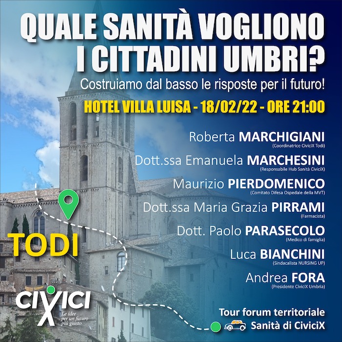 Primi incontri politico-elettorali in vista delle elezioni comunali a Todi. I CiviciX organizzano un incontro a Todi venerdì 18 febbraio sul tema della sanità umbra.