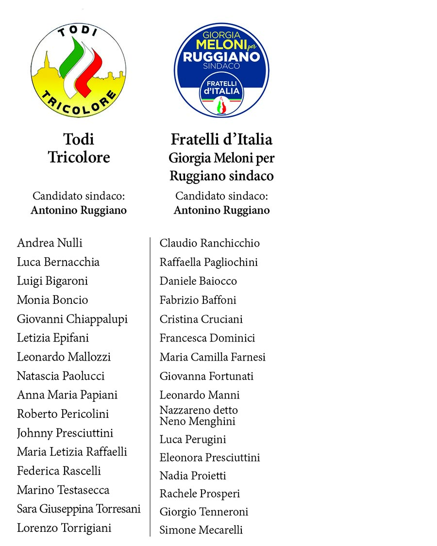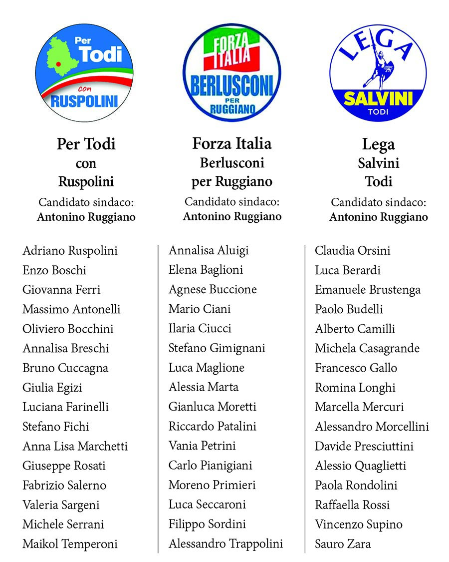 Cinque le liste a sostegno: Per Todi con Ruspolini, Forza Italia, Lega Salvini Todi, Todi Tricolore e Fratelli d'Italia