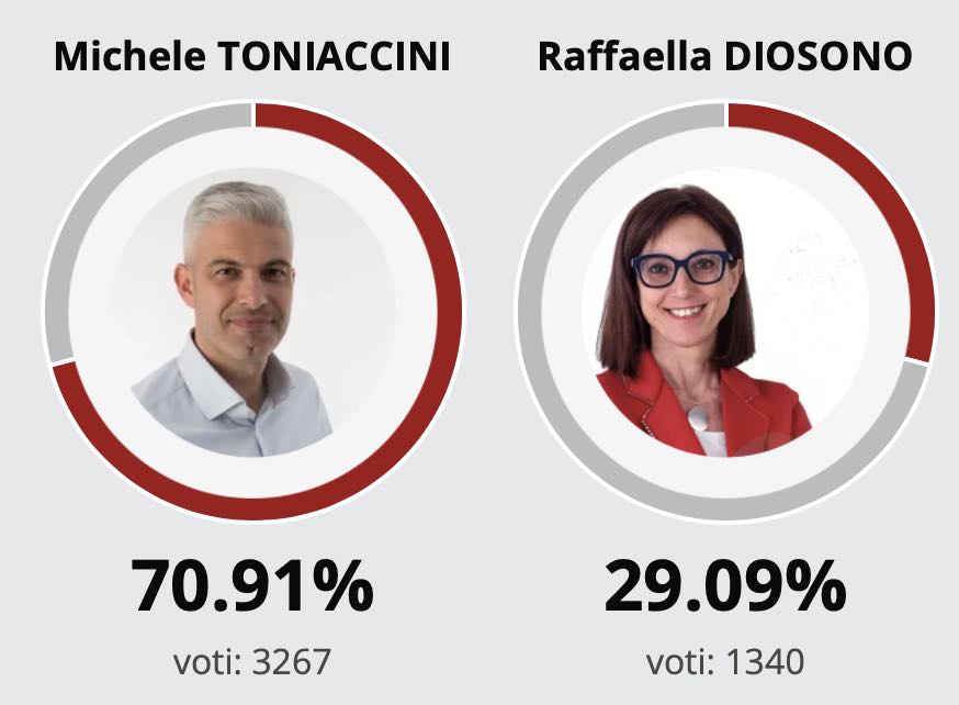 Il primo cittadino uscente, con il 70,91% dei voti, ha superato Raffaella Diosono (Lista Rilancio & Futuro) che ha raccolto il 29,09%