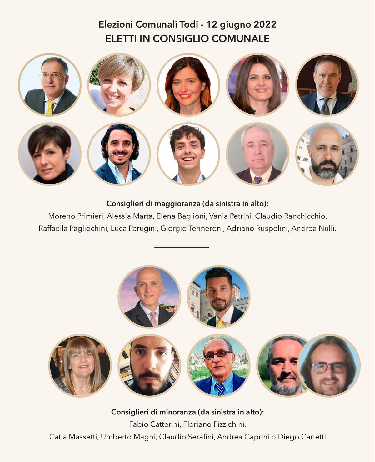 Al momento, almeno per Forza Italia, sembra scontato, all’insegna dello “squadra vincente” non si cambia, la chiamata nell’esecutivo di Moreno Primieri, Alessia Marta ed Elena Baglioni, tutti assessori uscenti. Per Fratelli d’Italia si dà per certa la riconferma di Claudio Ranchicchio, che potrebbe prendere pure il ruolo di vice-sindaco, con Raffaella Pagliochini riconfermata alla presidenza dell’assemblea.
