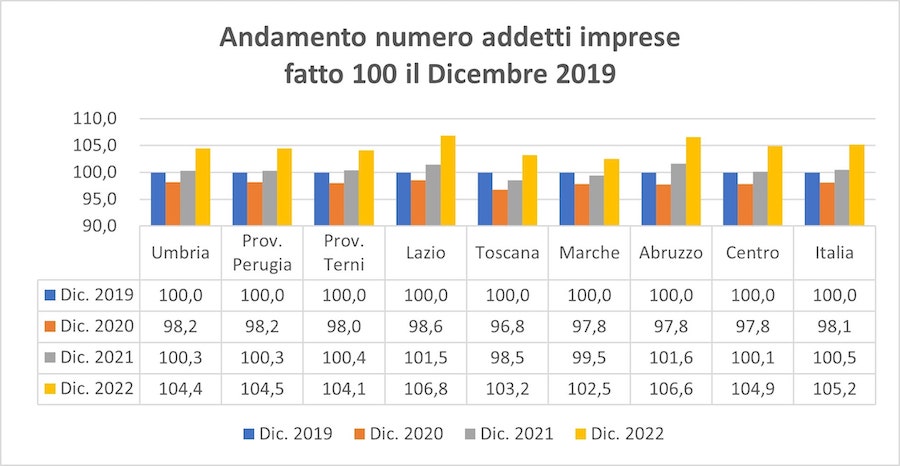 Quanto al recupero dell’occupazione nelle imprese persa durante la pandemia da Covid-19, in Umbria era già avvenuto nel 2021 e, a fine 2022, gli addetti delle imprese umbre superano di 11mila 262 unità quelli esistenti a dicembre 2019 (+4,4%). A livello di province, rispetto a dicembre 2019 quella di Perugia a dicembre 2022 presenta 8mila 846 occupati in più (+4,5%) e quella di Terni 2mila 416 nuovi addetti (+4,1%).
