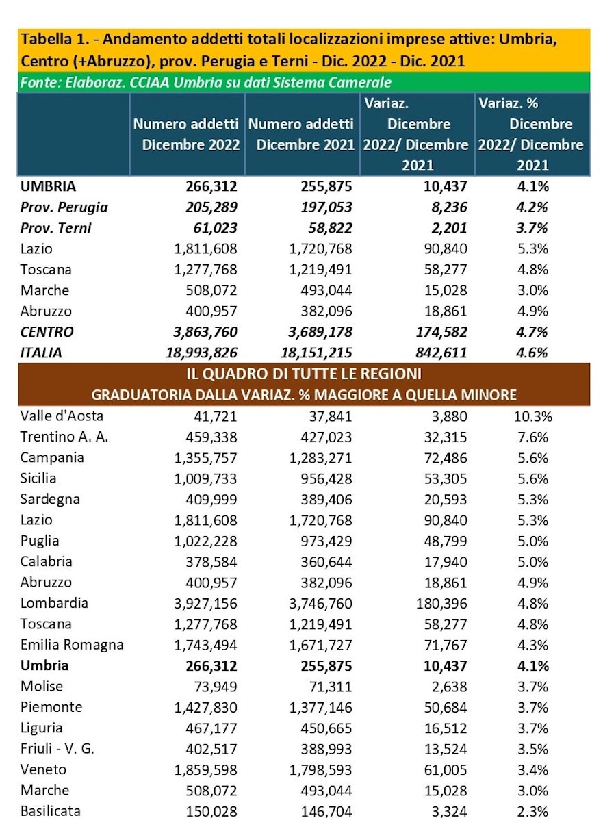 Nel 2022 le imprese umbre hanno accresciuto l’occupazione di 10mila 437 unità (+4,1%), passando da 255mila 875 addetti di dicembre 2021 a 266mila 312 di dicembre 2022. L’occupazione nelle aziende è aumentata di più in provincia di Perugia (+4,2%, +8mila 236 occupati) rispetto a quella di Terni (+3,7%, +2mila 201). L’andamento occupazionale umbro è inferiore, ma non di molto, a quello medio nazionale (+4,1% contro +4,6%) e questo si può anche spiegare con il fatto che il tessuto produttivo della regione, dopo aver perso molta produttività dal 2000 in poi (ma soprattutto durante la Grande Recessione scoppiata nel 2009 a seguito della crisi finanziaria internazionale esplosa nel 2008), è impegnata nel recupero della produttività, quindi dei livelli competitivi delle imprese, per cui a un aumento del Pil corrisponde, rispetto alla media italiana, un incremento un po’ minore degli addetti (con l’effetto però di migliorare, grazie all’incremento della produttività, la solidità dei posti di lavoro).