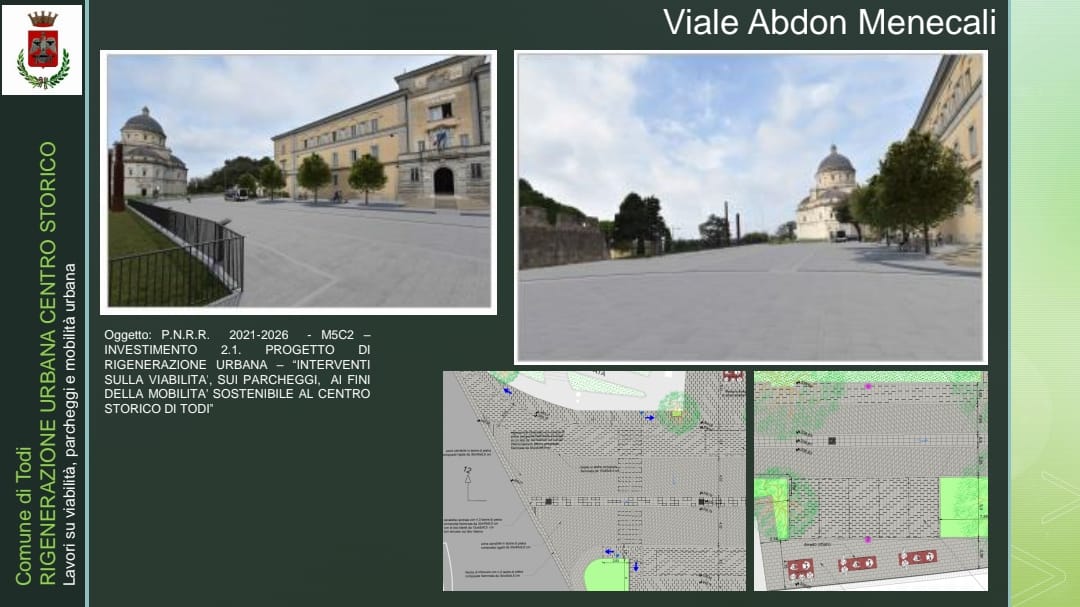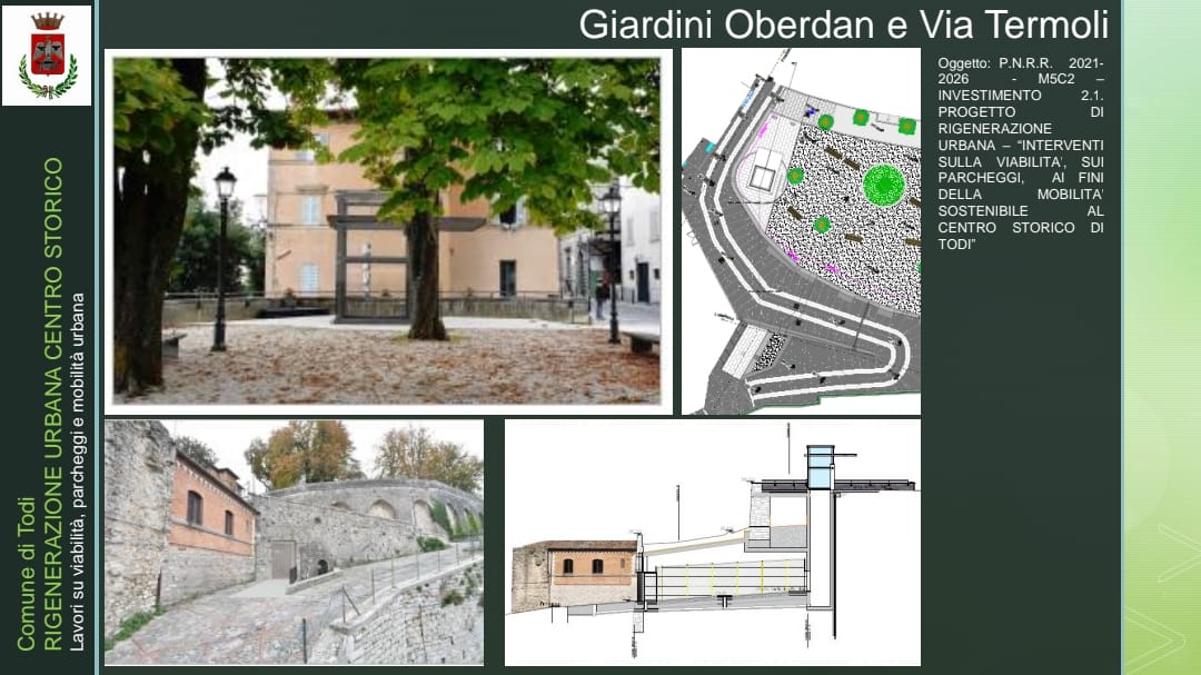 – realizzazione di viabilità di collegamento pedonale dallo sbarco dei nuovi ascensori in Via Termoli ai Giardini pubblici “Oberdan”, con eliminazione delle fontane sottostanti gli “Amici dell’Orto”, sottopassaggio e ulteriore ascensore con sbarco ai giardinetti a ridosso dell’inizio di Via Ciuffelli (tale intervento è connesso a quelli degli ascensori da Porta Orvietana, del percorso ciclo-pedonale “Giro di Todi” e della ripavimentazione di Via Ciuffelli e Via Mazzini).