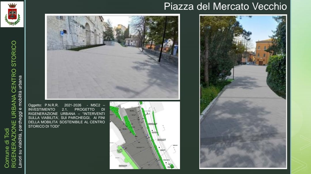 – riqualificazione piazza del Mercato Vecchio, con pavimentazione e valorizzazione area dei Nicchioni Romani. In tale contesto verrà realizzata anche una rampa di accesso pedonale dalla sottostante Via Cesia di collegamento con il nuovo parcheggio nella zona di San Carlo e il restauro delle mura urbiche (interventi oggetto di altre schede esplicative);