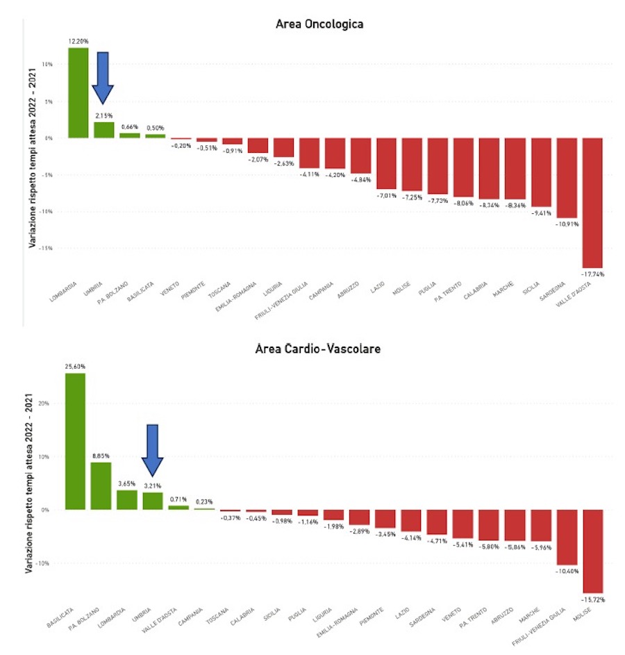 Nel report sono stati considerati i tempi di attesa per interventi chirurgici dell’area oncologica e dell’area cardio-vascolare. I dati medi a livello nazionale mostrano che viene rispettato il termine di 30 giorni di attesa per un’operazione di tumore solo per 3 casi su 4 (73,78%) mentre il rispetto dei 30 giorni di attesa previsto dalla legge per un intervento di area cardiovascolare vale per 4 casi su 5 82,31%). In questo contesto, l’Umbria migliora la propria performance rispetto al 2021, del 2,15% nell’area oncologica (seconda regione in assoluto) e del 3,21% nell’area cardio-toracica (quarta regione in assoluto).