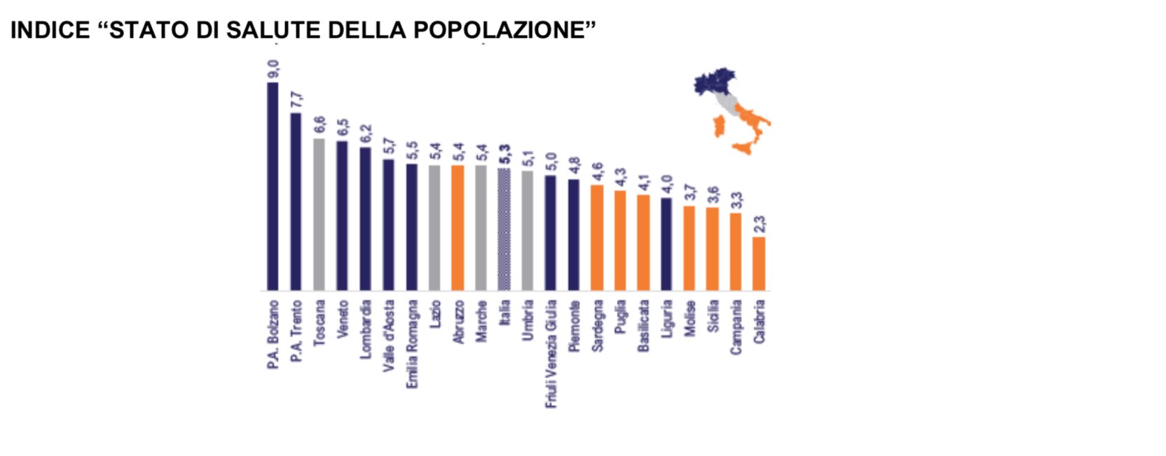 Il Meridiano Sanità Regional Index evidenzia che mettendo in relazione le performance dei sistemi sanitari regionali per gli Indici dei “Determinanti dello stato di salute” ( fattori individuali, fattori del contesto socio-economico e fattori del contesto ambientale) e del “Mantenimento dello stato di salute” (capacità di risposta del sistema sanitario ai bisogni di salute, l’efficienza, efficacia e appropriatezza dell’offerta sanitaria e le risorse economiche investite in sanità) emerge una relazione positiva tra le due grandezze. Infatti, le Regioni che ottengono i punteggi migliori in queste aree sono anche quelle caratterizzate dal migliore “Stato di salute della popolazione”. Questa relazione mette in evidenza come, purtroppo, il divario tra Nord-Centro e Sud continui a essere significativo e come mancati interventi su questi ambiti porteranno a un aumento dei divari tra le aree del Paese.