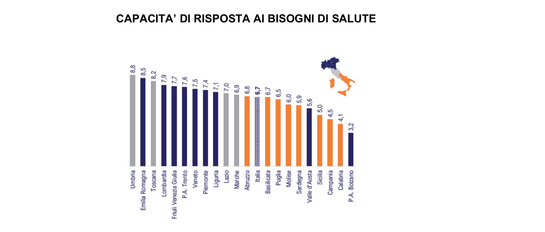 L’Umbria ottiene ottime performance nell’indice Capacità di risposta ai bisogni della salute, dove risulta prima con un indice di 8,8.