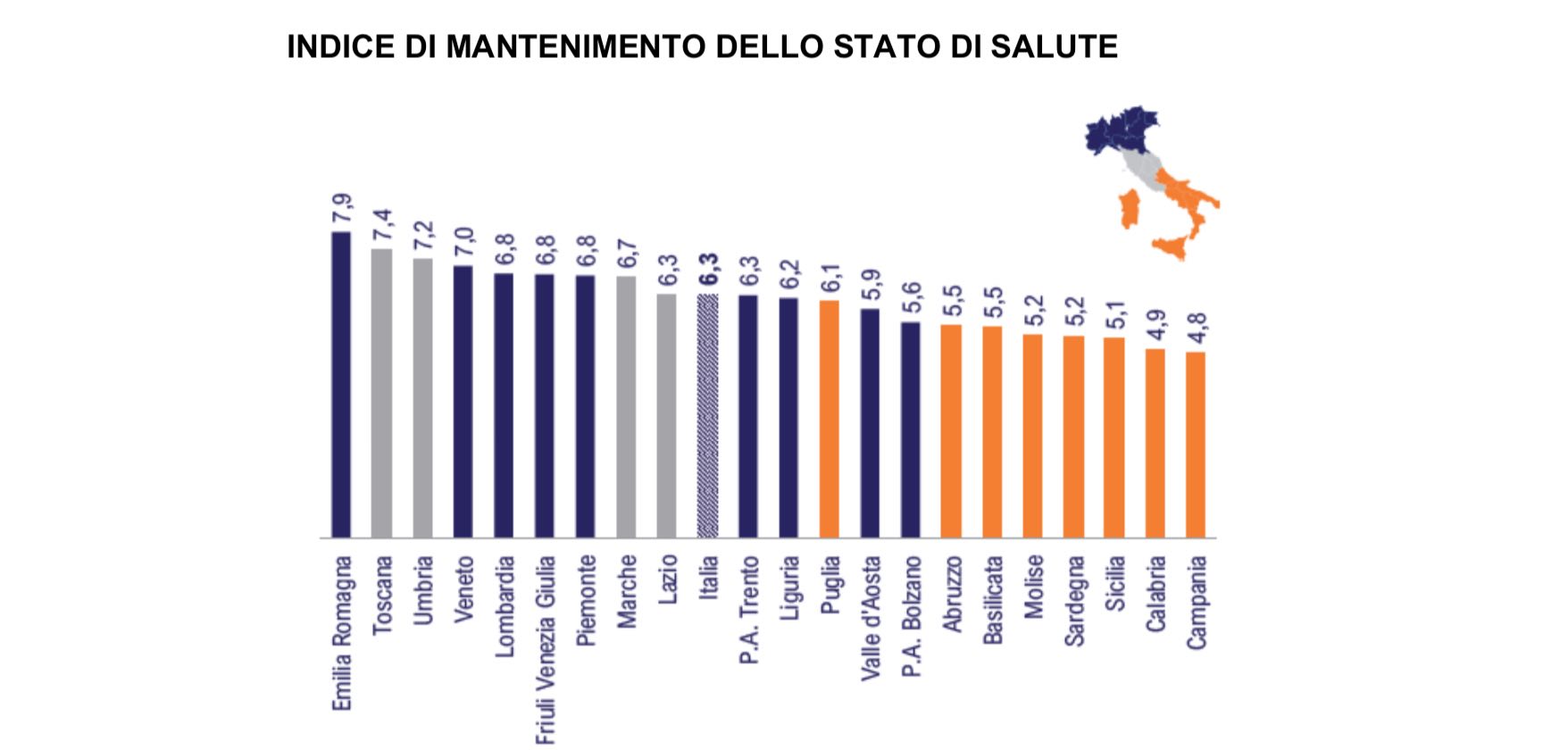 Ottimo l’indice di Mantenimento dello stato di salute, dove l’Umbria si attesta al terzo posto della graduatoria, con un indice di 7,2 (7,9 la regione migliore, 4,8 la peggiore).