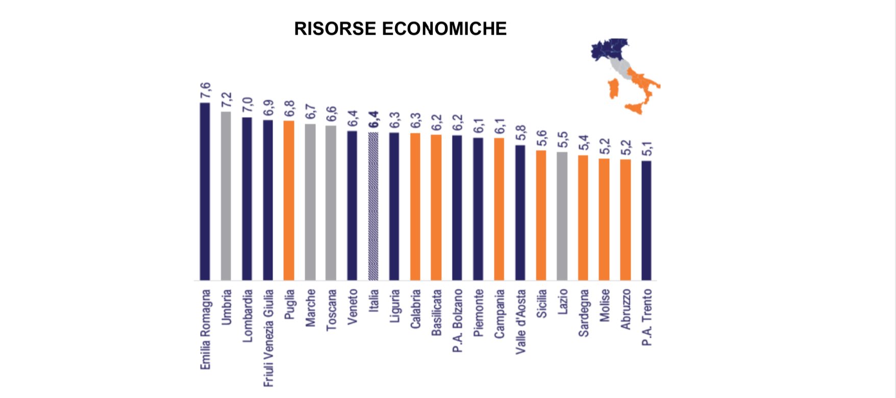 Nell’indice Risorse economiche la regione è seconda con un punteggio di 7,2 con una importante propensione ad investire per far fronte ai bisogni della salute.