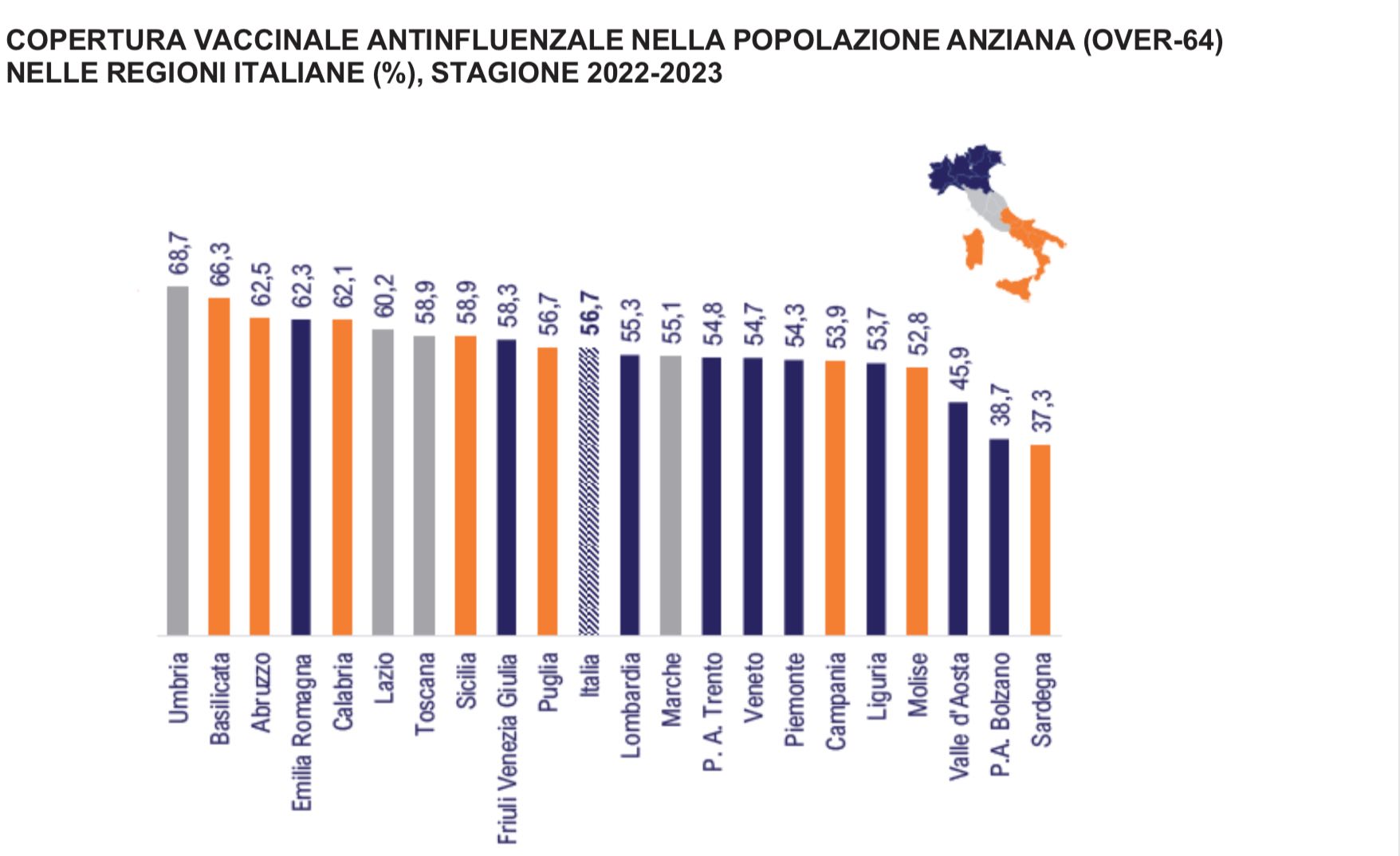 Considerata l’importanza dei vaccini come strumenti di prevenzione, nella stagione vaccinale 2022- 2023, la vaccinazione anti-influenzale prevista per gli over-64, in Italia ha raggiunto un tasso di copertura del 56,7%. Si tratta di un valore ancora molto lontano dall’obiettivo minimo del 75% e da quello ottimale del 95% che non vede grandi differenze tra le Regioni, nessuna delle quali ha raggiunto gli obiettivi minimi. Tutte le Regioni del Nord Italia, eccezion fatta per l’Emilia-Romagna e il Friuli-Venezia Giulia, si collocano al di sotto della media nazionale mentre alcune Regioni del Sud come Puglia, Sicilia, Calabria e Basilicata sono al di sopra della media nazionale.