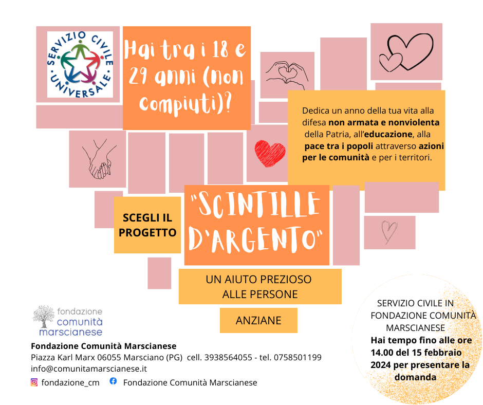 Sono disponibili due posti all’interno della Fondazione Comunità Marscianese. Possono fare domanda tutte le persone dai 18 anni ai 29 anni (non ancora compiuti).