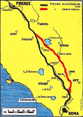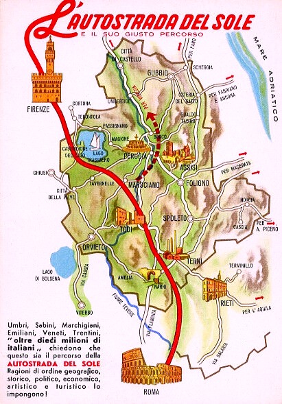 Gli umbri, in sostanza, in quel tempo, spingevano affinché la costruenda autostrada, giunta ormai nella zona di Sinalunga, deviasse decisamente verso il Trasimeno, proseguisse verso Marsciano, Fratta Todina, Monte Castello di Vibio e Todi, scendesse fino a passare tra Terni e Narni e quindi, inoltrandosi nella Sabina, arrivasse a Fiano Romano nei pressi di Roma nord. Alcuni residenti di Fratta Todina e Monte Castello ricordano che, allo scopo, i loro terreni erano già stati “picchettati” con la scritta: “Autostrada del Sole”…..
