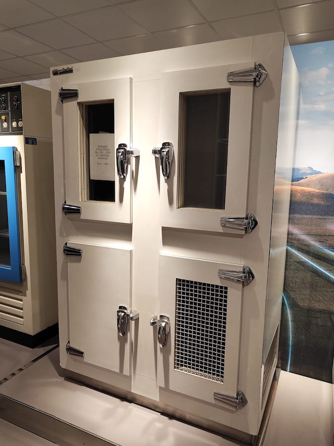 Nel 1961 invece un altro primato. Nell’ambito della refrigerazione, viene presentata alla Fiera di Milano la prima apparecchiatura in Europa in grado di scendere sotto a -100°C con compressori tradizionali. Si trattava di un congelatore a tre stadi per conservazione di materiale biologico, capace di raggiungere i -104°C. Di questi “congelatori” è esposto un modello a -80°C del 1975, precursore degli attuali ultra-freezers realizzati per conservare i vaccini anti-Covid!