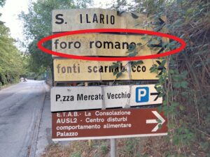 No, non c’è, dato che il foro dell’antica Tuder, come ormai noto a tutti, coincide con l’attuale Piazza del Popolo i cui principali monumenti in superficie risalgono al Medioevo. Perché allora questi cartelli? Perché ancora in un recente passato si considerava la piazza del Mercataccio, sulla quale si affacciano i Nicchioni romani, il foro antico della città. Ed è proprio verso il Mercataccio che questi cartelli indirizzano il turista, salvo poi disorientarlo proprio al suo imbocco dove la freccia marrone presente, girata in origine proprio verso il parcheggio dei Nicchioni, da tempo risulta erroneamente ruotata verso via Roma (come del resto è ruotata in maniera fuorviante pure l’altra freccia indicante Piazza del Popolo).