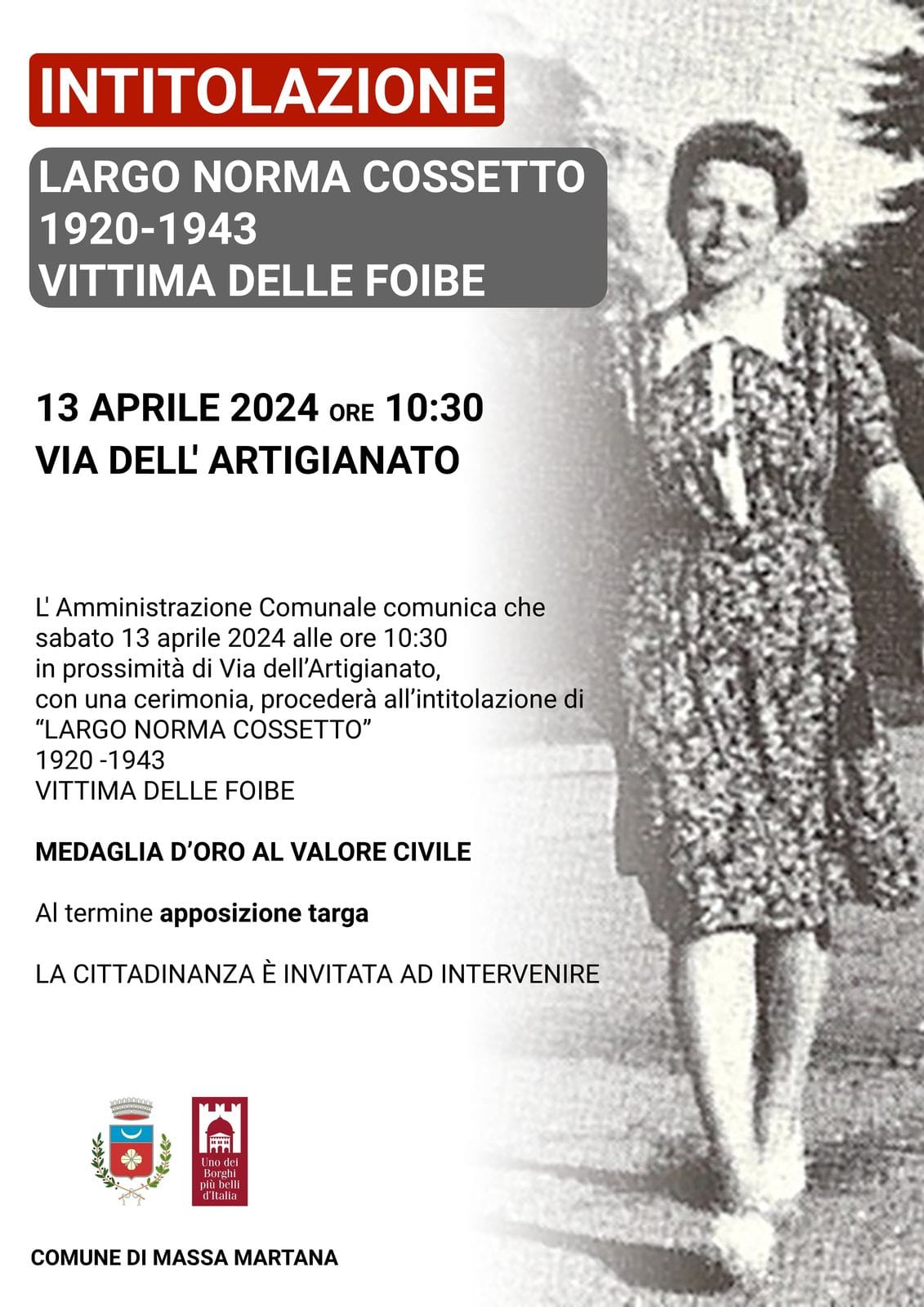 Sabato 13 aprile ore 10.30 a Massa Martana si terrà la cerimonia d’intitolazione di un’area a Norma Cossetto, sita nei pressi di Via dell’Artigianato. Norma Cossetto è una vittima delle Foibe insignita di medaglia d’oro al valore civile. Una giovane donna che ha subìto atroci sofferenze e soprusi durante la sua prigionia, fino ad essere infoibata. Con lei verranno ricordati tutti i martiri di questa terribile pagina della storia del secolo scorso.