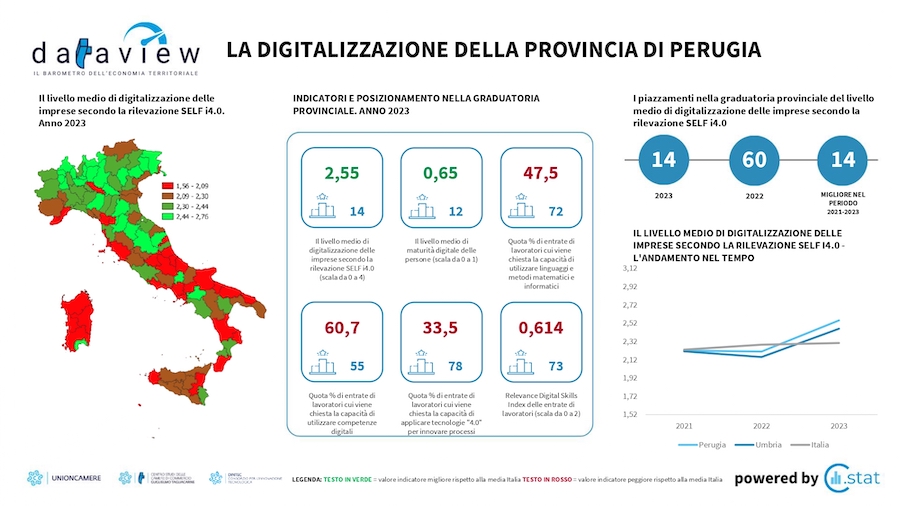 Nella graduatoria provinciale del livello medio di digitalizzazione delle imprese secondo la rilevazione SELF i4.0, la provincia di Perugia passa dal 60esimo posto (su 107) del 2022 al 14esimo del 2023, con un punteggio di 2,55 nella scala tra 0 e 4. Miglioramento anche in provincia di Terni, anche se meno marcato. La provincia ternana, che nel 2022 era nei bassifondi della classifica provinciale del livello medio di digitalizzazione delle imprese, piazzandosi al 96esimo posto su 107, nel 2023 passa in 74esima posizione (la rilevazione SELF i4.o assegna al Ternano un punteggio di 2,14 su una scala da 0 a 4).