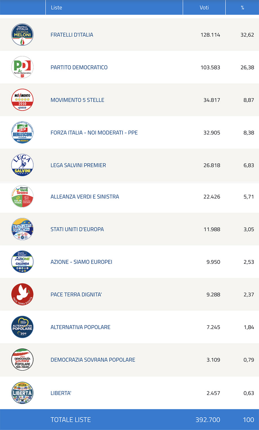 Nel centro destra, Forza Italia con l’8,38% (in crescita rispetto al 6,42% del 2019) supera la Lega che si ferma al 6,83%, che invece crolla rispetto a 5 anni fa quando era il primo partito con il 38,18%. Seguono Alleanza Verdi e Sinistra (5,71%), Stati Uniti d’Europa (3,05), Azione (2,53%).