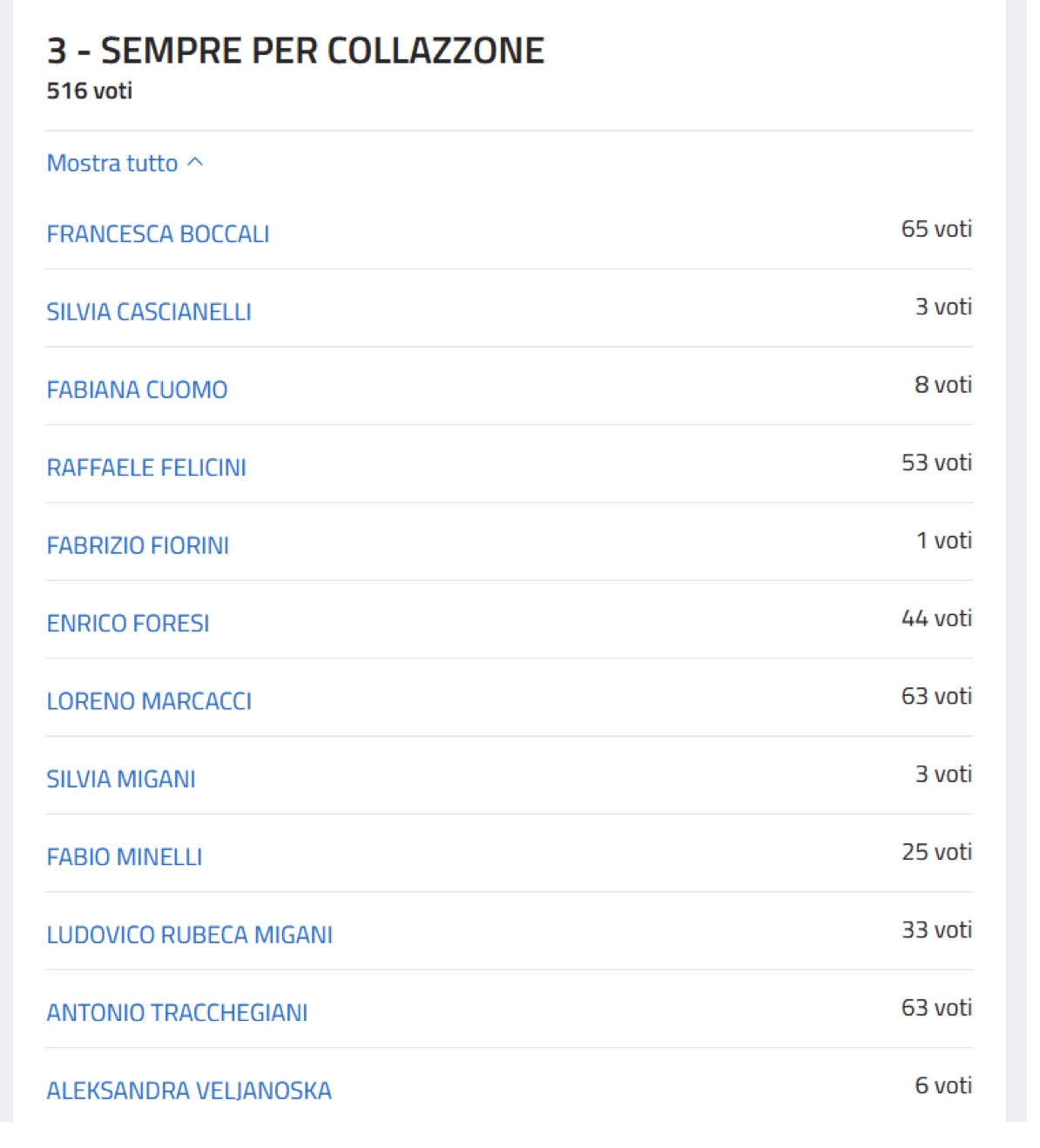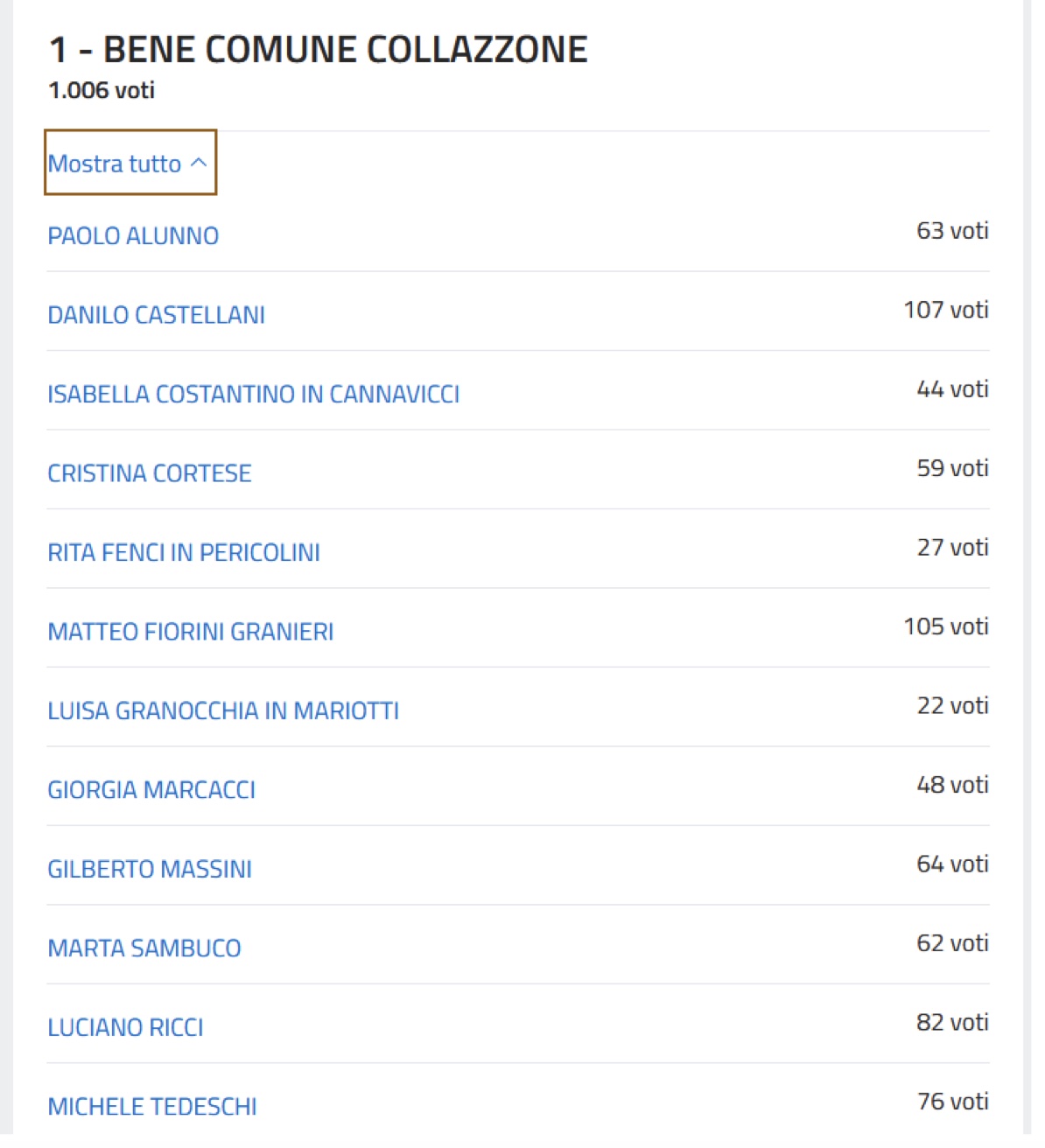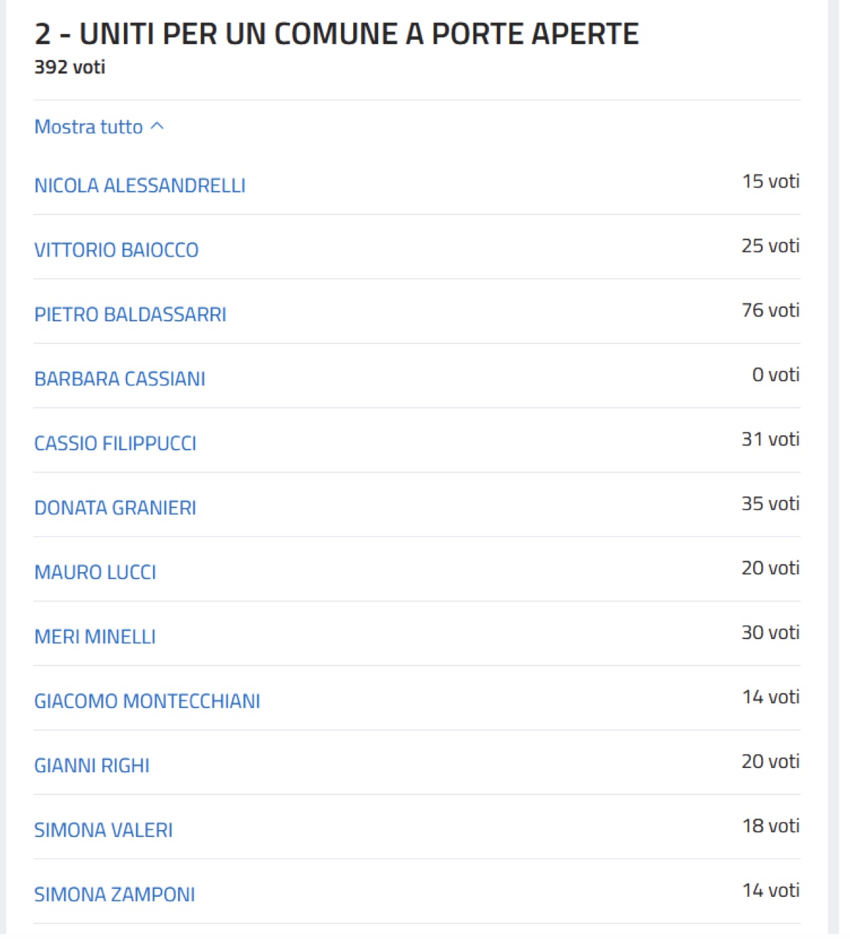 A guidare la graduatoria Danilo Castellani con 107 preferenze e Matteo Fiorini Granieri con 105. Segue, sempre nella lista 1, Luciano Ricci con 82 voti. Quarti, entrambi con 76 preferenze, Michele Tedeschi della Lista 1 e Pietro Baldassarri della Lista 2 a sostegno di Augusto Morlupi.