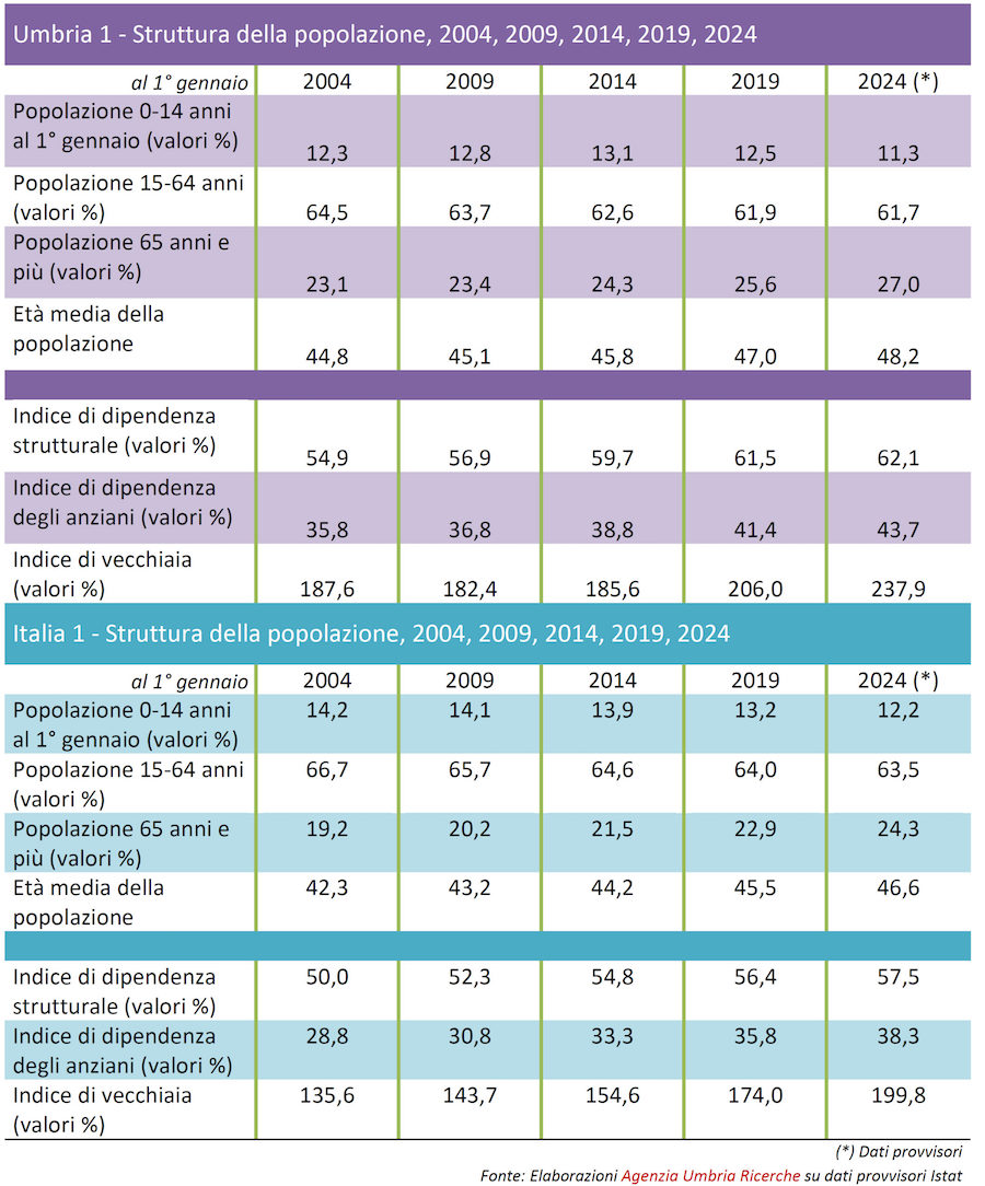 Gli umbri con un’età compresa tra 15 a 64 sono scesi dal 64,5% al 61,7%: -2,8%. L’Italia fa registrare una diminuzione del -3,2%. Per quanto riguarda gli over 65 umbri, il dato nel 2004 era pari al 23,1%, mentre nel 2024 al 27,0%. In pratica, nei venti anni considerati abbiamo una crescita del 3,9% delle persone più mature. L’Italia ha fatto registrare un +5,1% (2004=19,2% → 2024=24,3%).