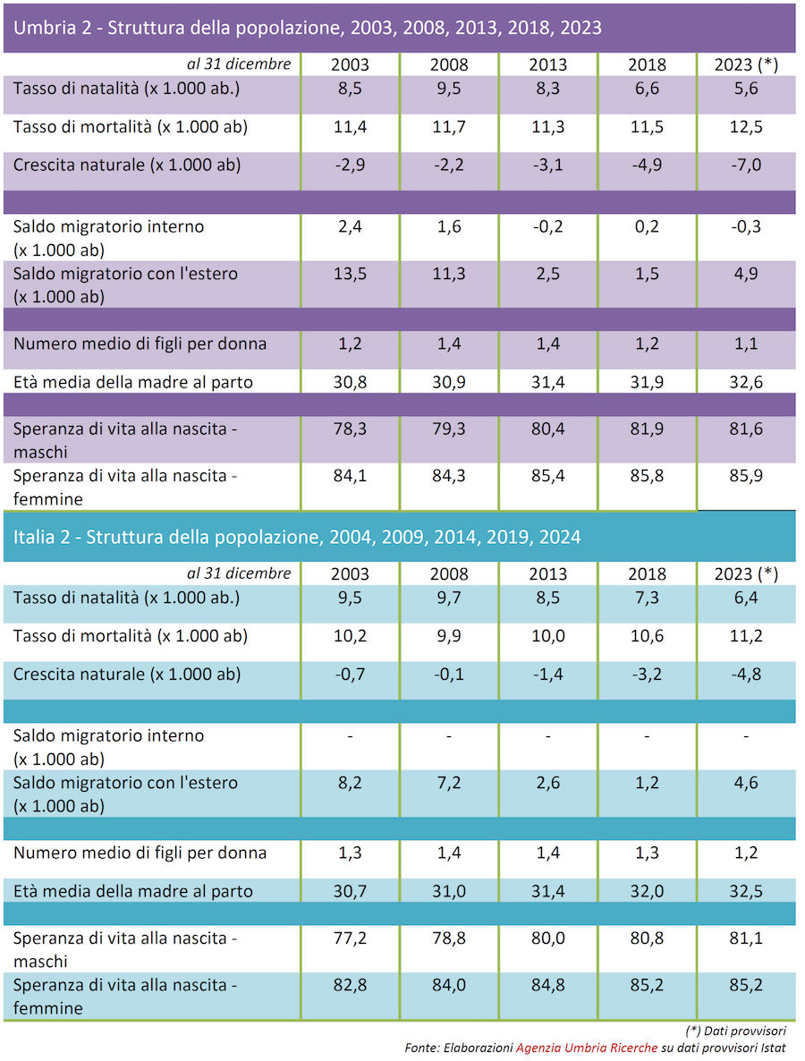 Nei 20 anni presi in considerazione, la crescita naturale (differenza tra tasso di natalità e mortalità), sia per l’Umbria che per l’Italia, ha fatto registrare valori sempre negativi. Per cui, quando si è avuto un aumento della popolazione è dipeso dall’andamento positivo del movimento migratorio.